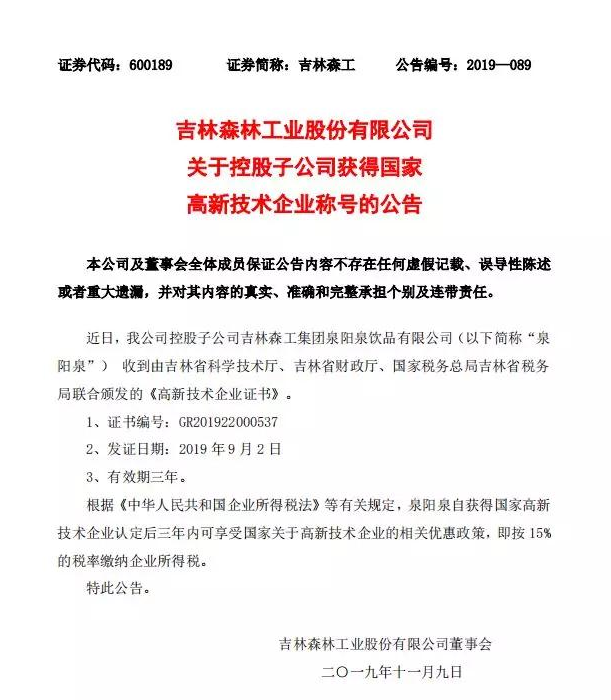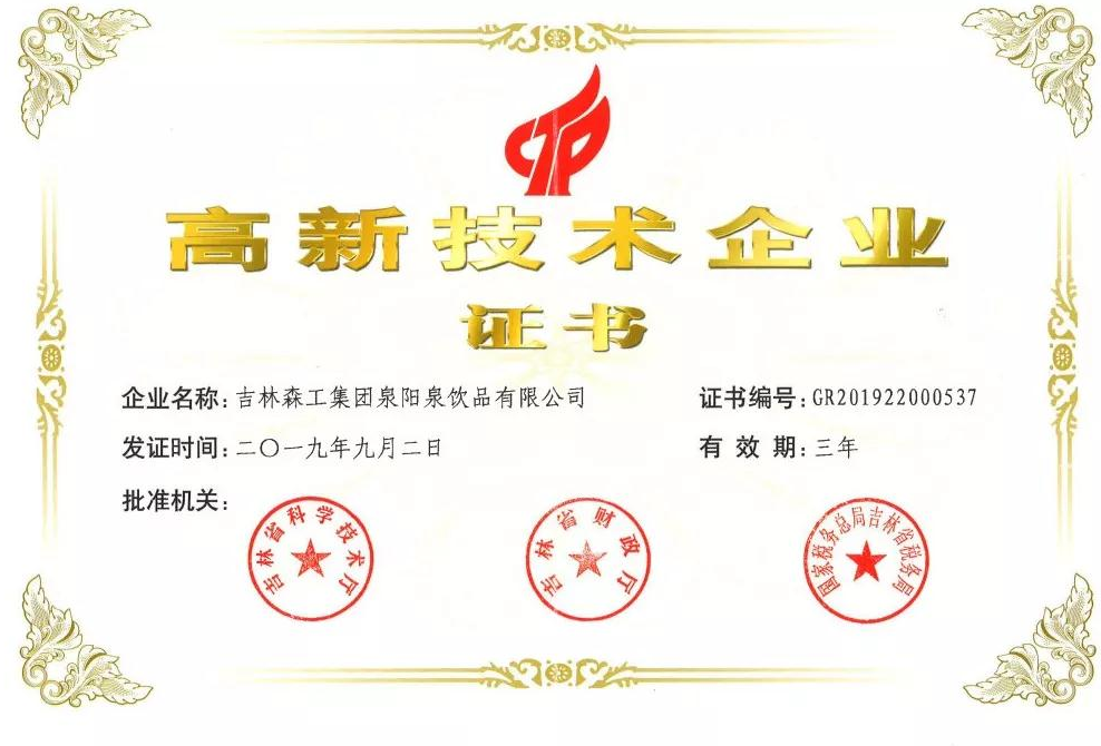 ? ? ? 根據(jù)科學(xué)技術(shù)廳、吉林省財(cái)政廳、國(guó)家稅務(wù)總局聯(lián)合頒布的《關(guān)于公布吉林省2019年第一批國(guó)家高新技術(shù)企業(yè)認(rèn)定結(jié)果的通知》,經(jīng)過層層審核,吉林森工集團(tuán)泉陽(yáng)泉飲品有限公司由吉林省科學(xué)技術(shù)廳、吉林省財(cái)政廳、北京市國(guó)家稅務(wù)局、國(guó)家稅務(wù)總局吉林省稅務(wù)局局聯(lián)合批準(zhǔn)下發(fā)的高新技術(shù)企業(yè)認(rèn)定。